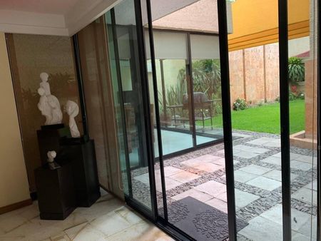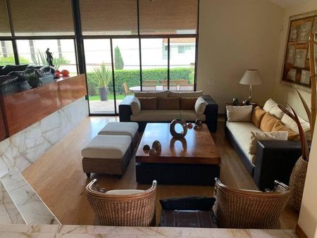 Cuenta con amplia cochera techada para 3 ó 4 autos, la casa esta rodeada por hermosos jardines, agradables terrazas con amplios espacios, sala, comedor, estar TV, lujosa cocina con isla, ante-comedor, 3 recámaras en planta baja cada una con su baño y amplios closets, dos de las recámaras cuentan con terraza.