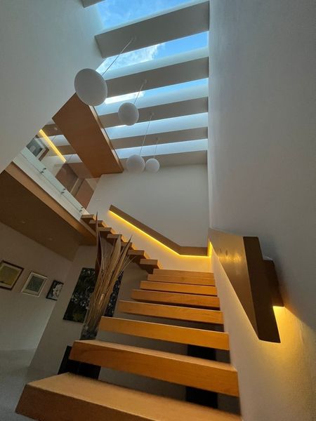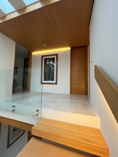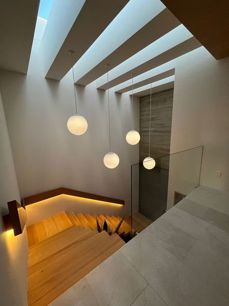 Entrada principal de 6 metros de altura, con cubo de luz en la escalera, teniendo detalles en madera de encino, tanto en plafones como en la escalera, haciendo el entorno muy cálido.